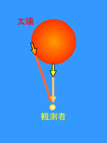太陽を例にとってみると、 地球上の観測者には、太陽から同時に放射された光でも、その中心からくる光と縁の方からくる光とでは、 約2秒の差があります。 |