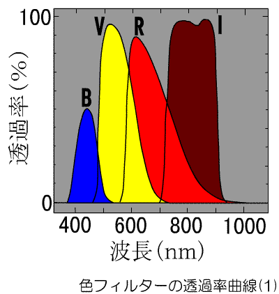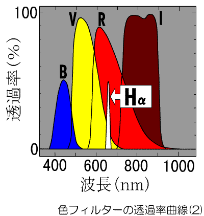 Hαバンドは、BバンドやVバンドに比べて、波長領域の幅が非常に狭いのが分かります。 Hαバンドは、輝線スペクトル(水素のHαバルマー輝線)の波長域にあたるからです。 |